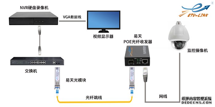 易天光通信(ETU-LINK)今天就為大家介紹下用PoE光纖收發(fā)器以及相關(guān)設(shè)備,組建遠(yuǎn)程光纖監(jiān)控系統(tǒng)。